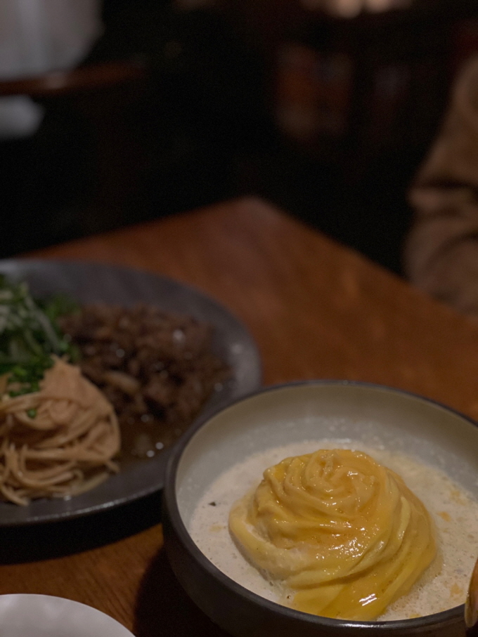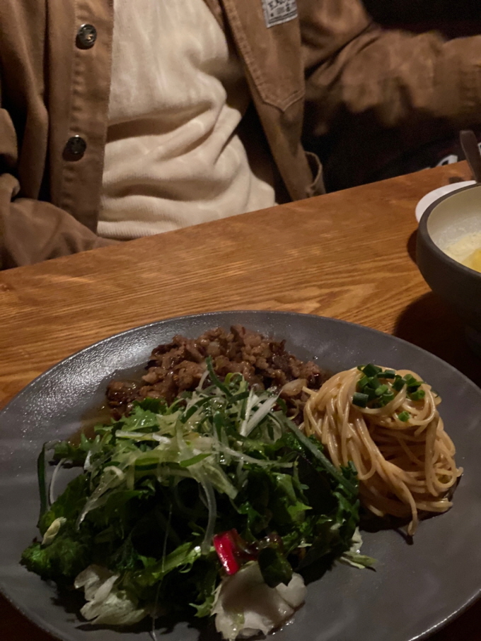 이것이 문화식당의 삼합. 샐러드, 파스타, 고기. 아 이런 것을 삼합이라고 부르다니. 완벽하네요. 코로나 이전에 친한 사람들하고 파티를 했었을 때, 누가 샐러드 파스타를 해줬는데, 이걸 버무려서 만든 게 그 때 그 맛이었던 것 같았다. 눈이 뜨이는 맛이었는데, 이 삼합도 같이 먹어도 맛있고, 따로 먹어도 또 맛있는 그런 맛이었다.