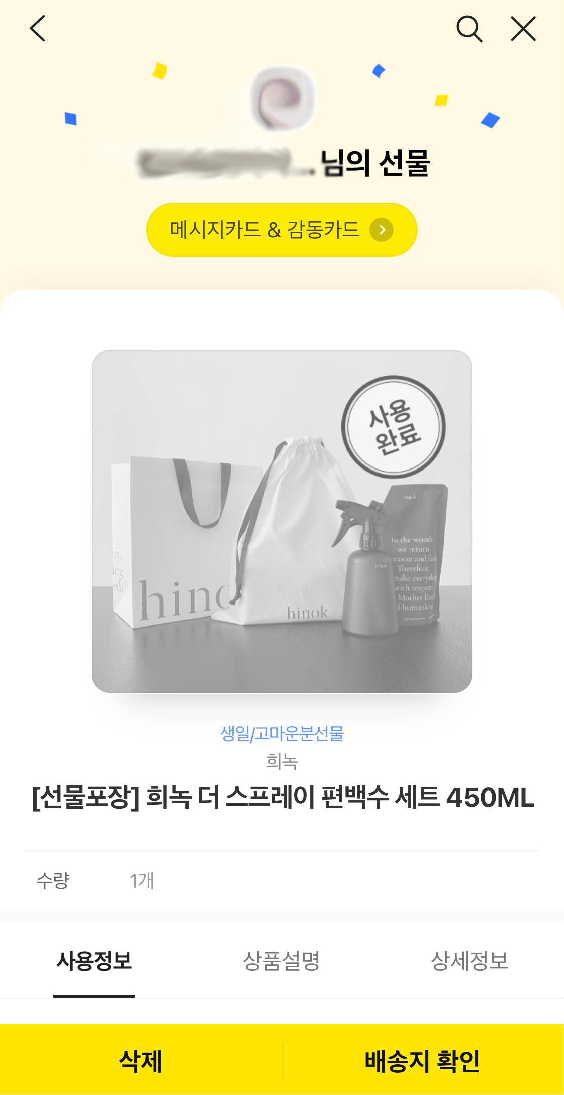 나는 카카오톡 선물하기를 통해 이 제품을 선물받았다.