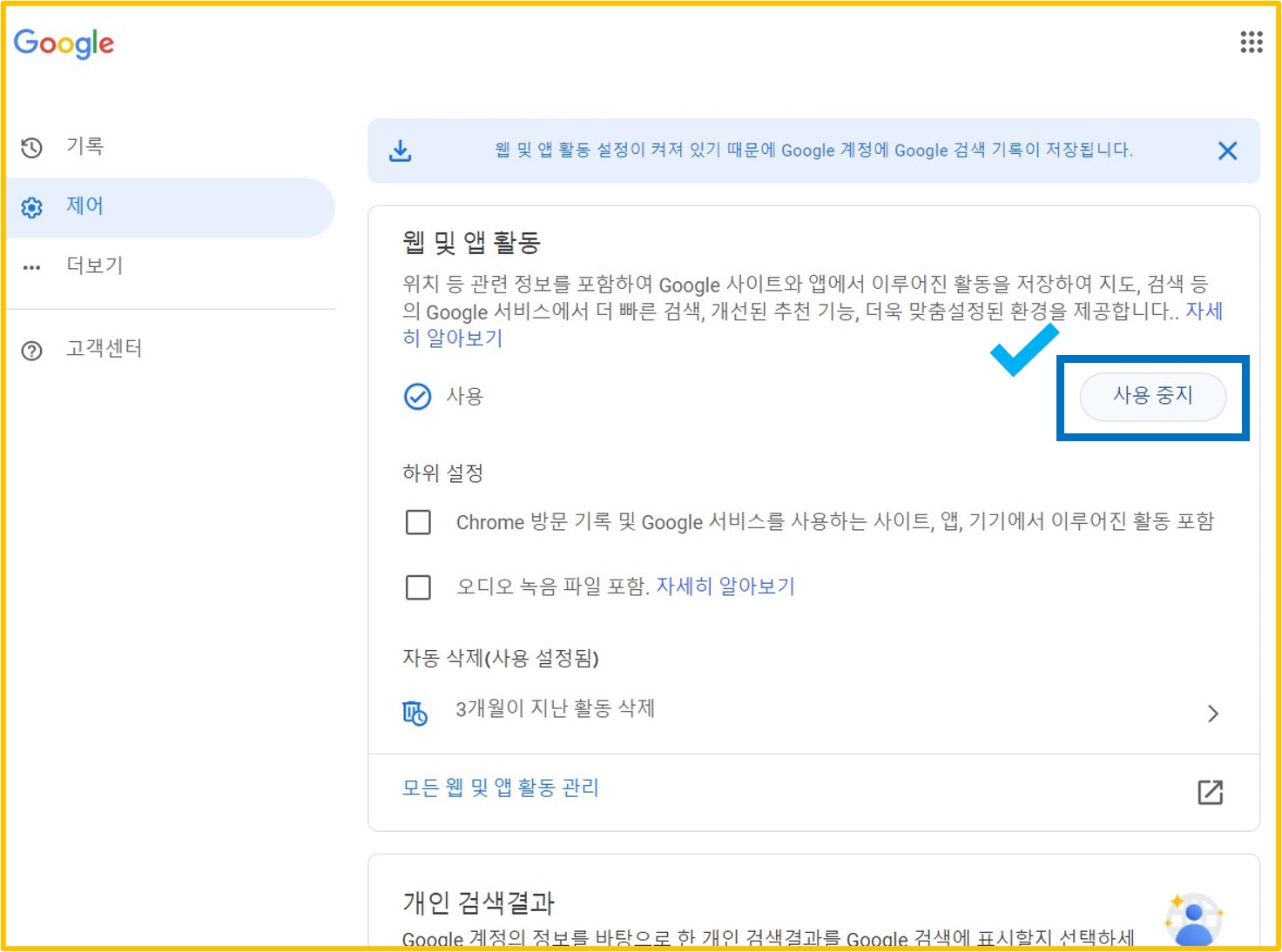 설정이 꺼진 것까지 확인하면 구글 검색기록 끄기가 완료된 것입니다!