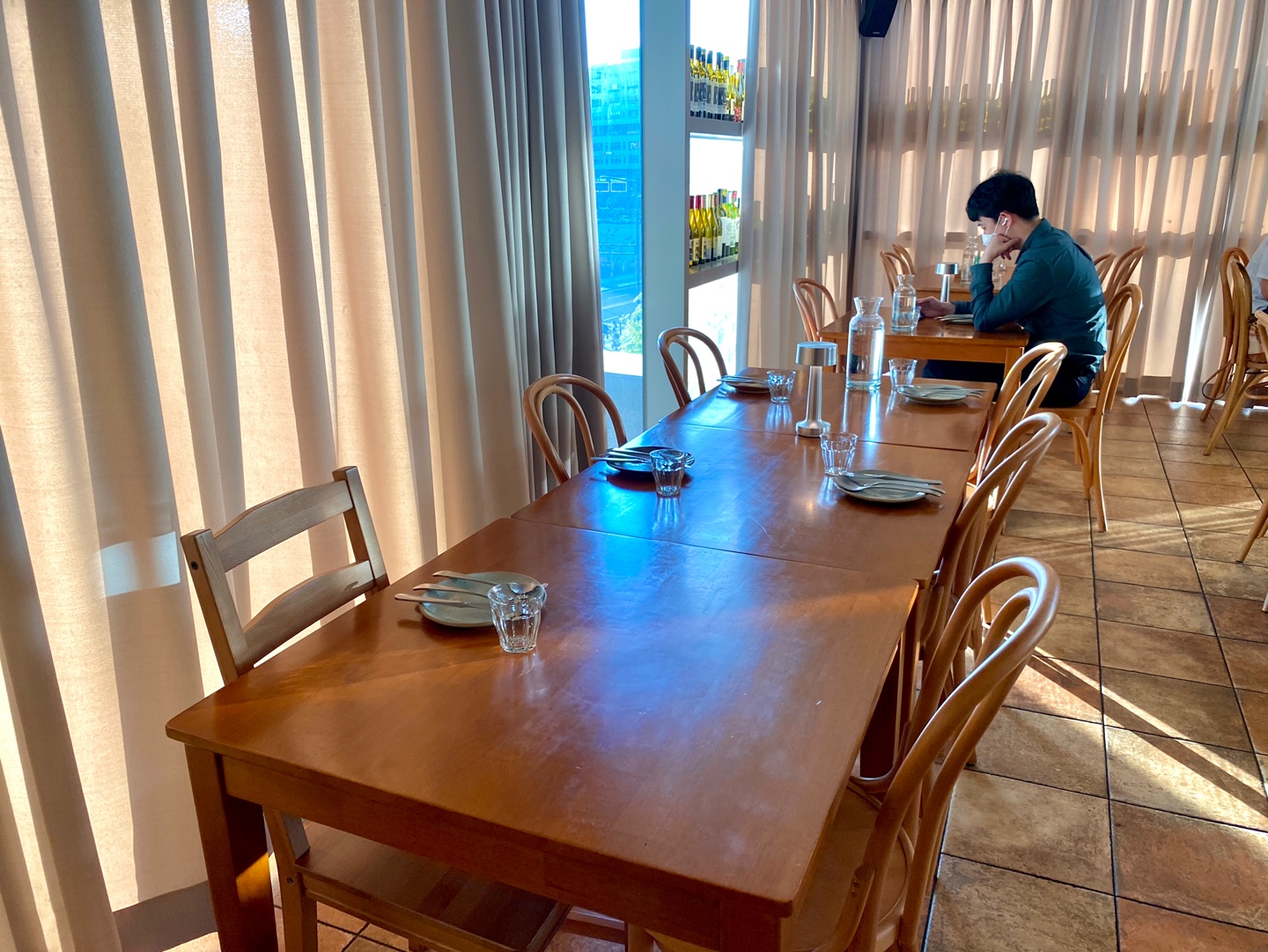 저희는 네이버 예약을 통해 미리 예약을 해두었고 5인이어서 이렇게 길쭉한 테이블 좌석을 안내받았어요. 어제 갔었는데 거의 모든 테이블이 차 있어서 내부 사진을 찍기가 어려웠어요.