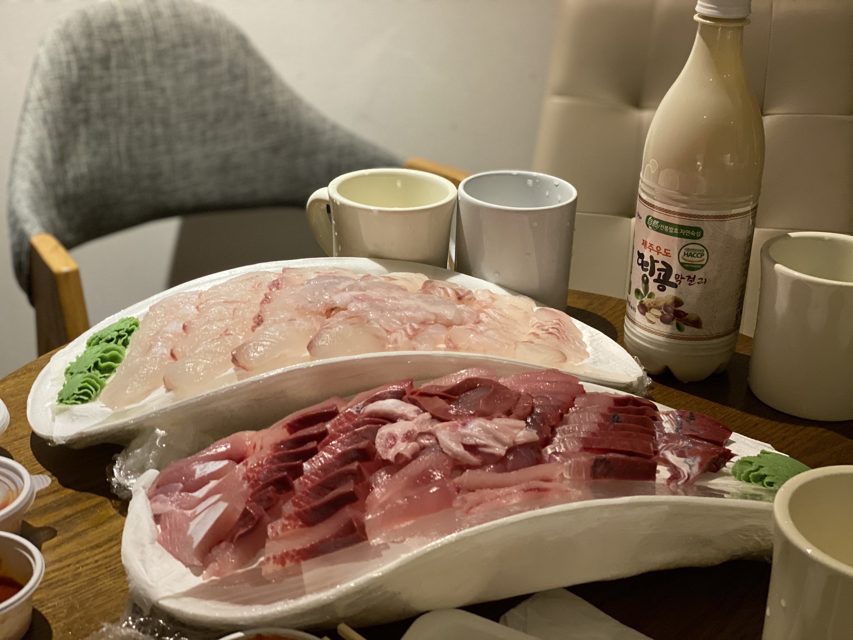회를 사러 서귀포 올레시장으로 고고. 여러군데 돌아다니는 것이 귀찮아 검색해서 괜찮다는 가게로 직행했다. 가게이름은 기흥어물! 차를 갖고 갔지만 시장 안을 돌아보고 싶다면 걸어가는 것을 추천! 시장 근처에 차 대는 게 쉽지 않았다. 감사하게도 우리가 회를 산 가게에서 옆에 자리를 만들어주셔서 한두바퀴 돌다가 편히 차를 댈 수 있었지만. 회는 맛있었다! 사실 ‘회’의 가격대라는 것을 잘 모르지만 너무 비싸지 않고 맛좋으면 감사하게 먹는데, 그런면에서 매우 만족. 양도 많아서 배부르게 잘 먹었다!